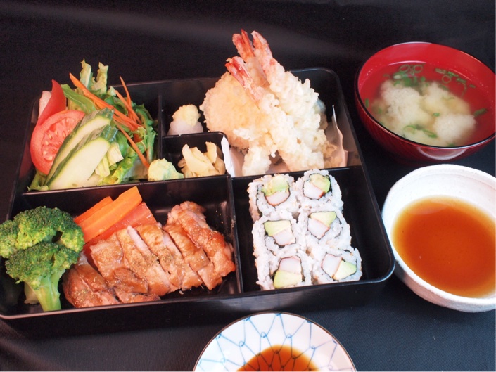 Chicken Teriyaki, Tempura, California Roll, Salad in bento box served with Miso Soup